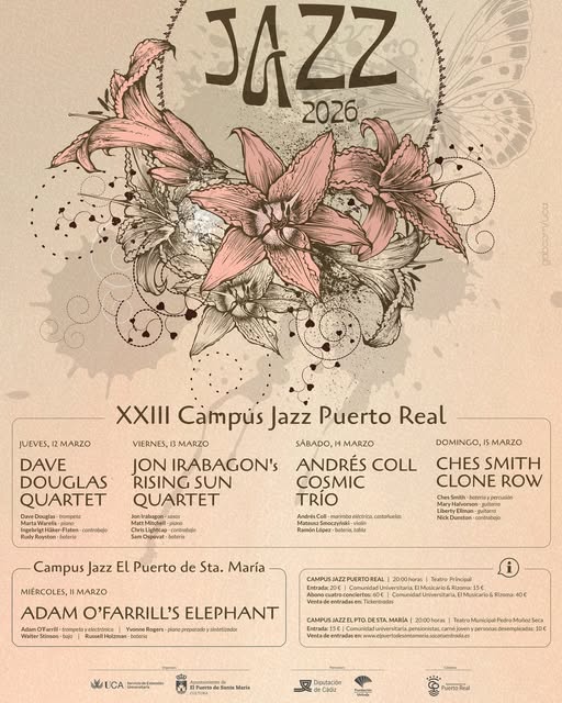 Dave Douglas Quartet, Ches Smith y su proyecto Clone Row, Jon Irabagon’s Rising Sun Quartet y Andrés Coll Cosmic Trío protagonizarán el próximo ciclo de conciertos de la XXIII edición de Campus Jazz Puerto Real, mientras que Adam O’Farrill’s Elephant actuará en el marco de Campus Jazz El Puerto de Santa María, como parte de una cita muy especial organizada por el Servicio de Extensión Universitaria del Vicerrectorado de Sostenibilidad y Cultura de la Universidad de Cádiz. y en el caso de O’Farrill, por el Ayuntamiento de El Puerto de Santa María.