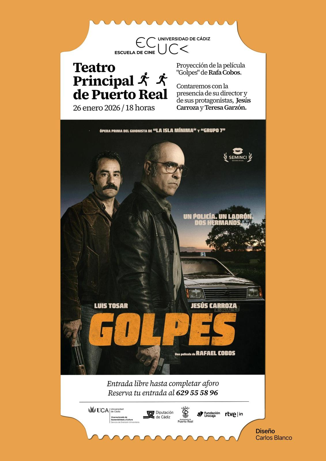 El Servicio de Extensión Universitaria del Vicerrectorado de Sostenibilidad y Cultura de la Universidad de Cádiz acogerá el próximo lunes 26 de enero de 2026, a las 18.00 horas, en el Teatro Principal de Puerto Real, la proyección del largometraje Golpes, dirigido por Rafael Cobos. La sesión contará con la presencia del propio director, así como de sus protagonistas Teresa Garzón y Jesús Carroza.