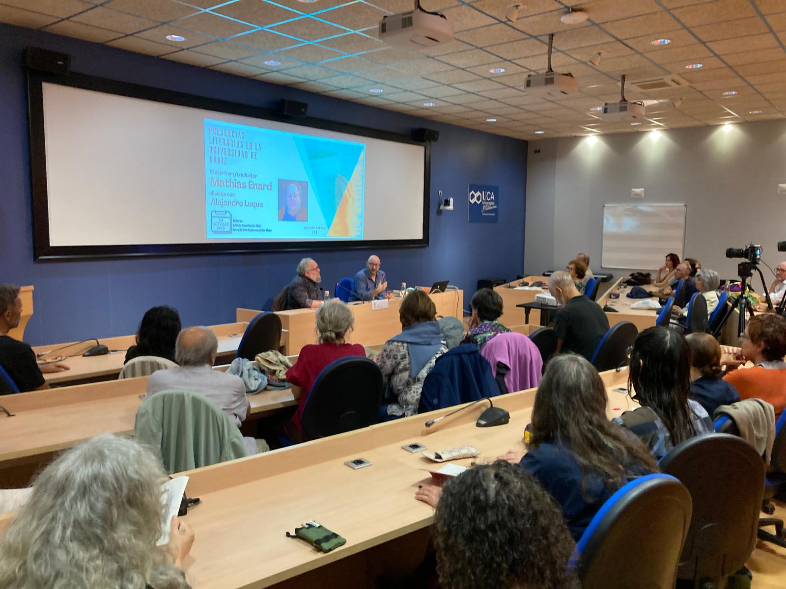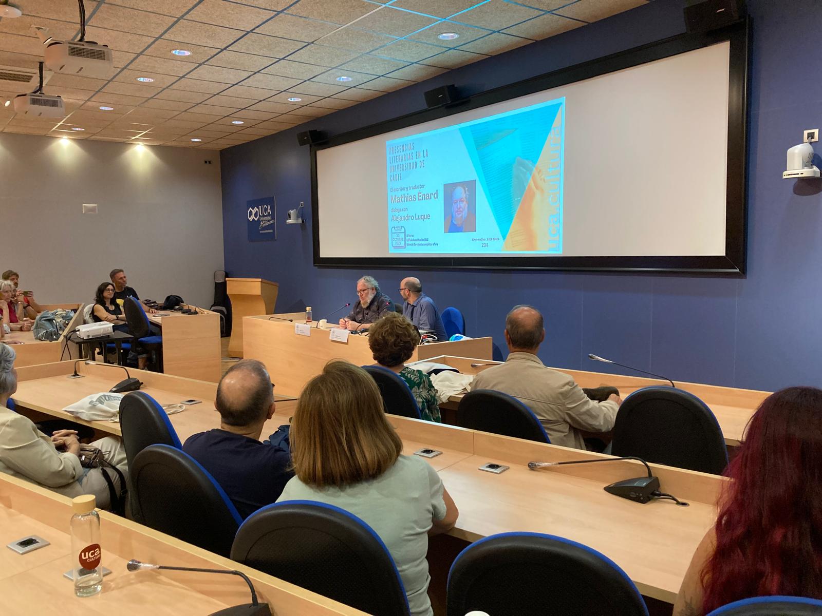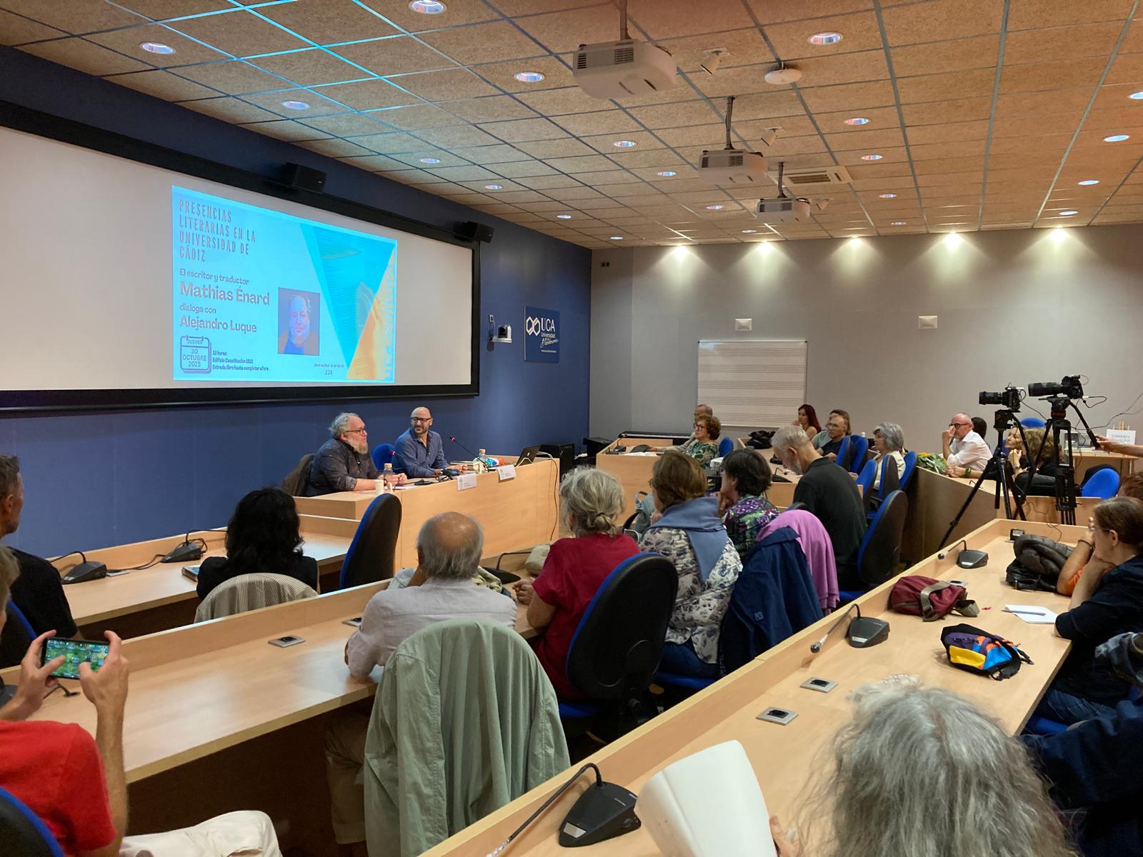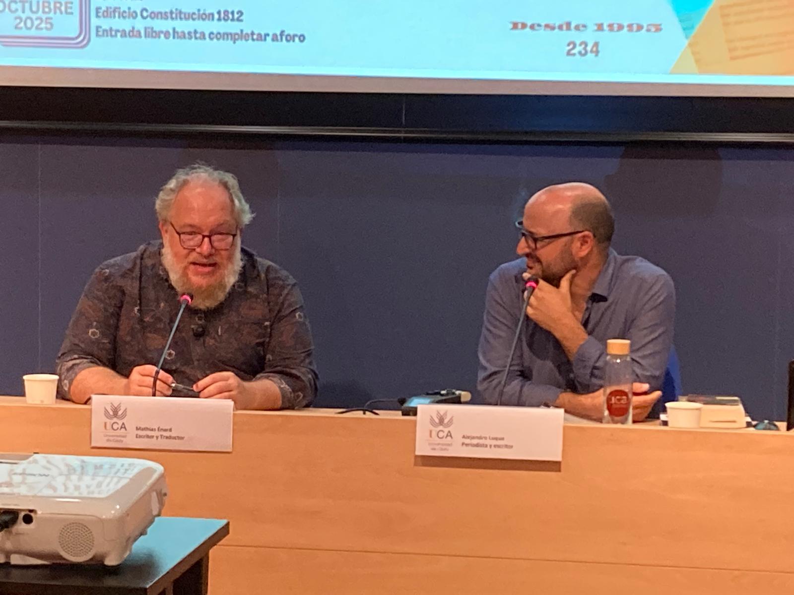 El Servicio de Extensión Universitaria del Vicerrectorado de Sostenibilidad y Cultura de la Universidad de Cádiz organizó una nueva cita, en el edificio Constitución 1812, del ciclo Presencias Literarias en la Universidad de Cádiz. La cita fue el 30 de octubre con el escritor y traductor francés Mathias Enard que dialogó con el periodista Alejandro Luque.